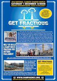 We will also be targeting the insanity of the drive towards exploiting more - and new types of - fossil fuel. We will be acting in solidarity with the many local campaigns around the country resisting the expansion into this country of the risky and destructive pratcice of 'hydraulic fracturing' or "fracking" for previously un-tappable "shale gas". This is a major prop for George Osborne's new "dash for gas" which threatens to expand the exploitation of this fossil fuel in a way that would effectively blow the (inadequate but hard fought for) Climate Act out of the water (see here).